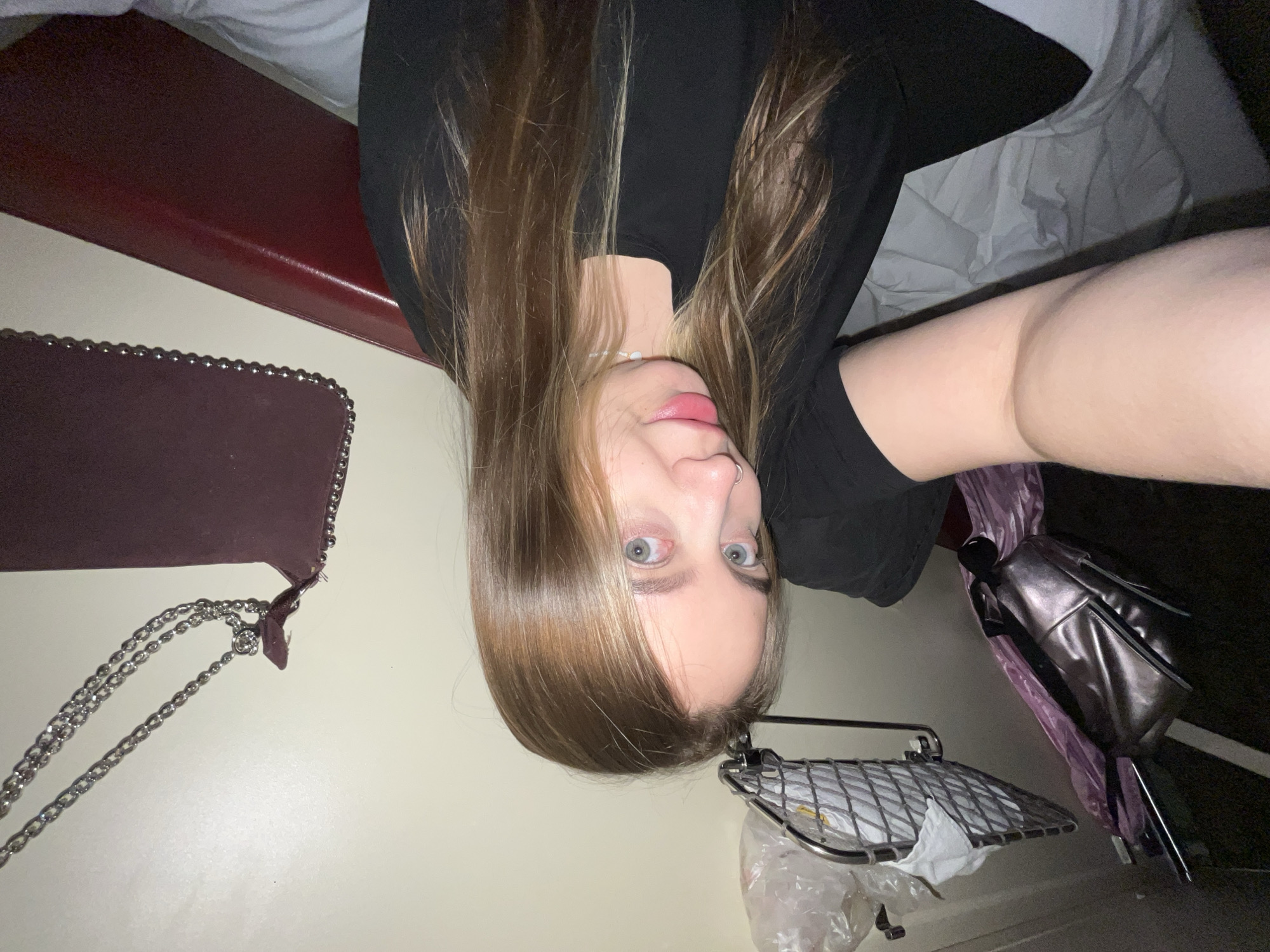 A selfie-style photograph features a woman with light brown hair and blue eyes. She is wearing a black shirt. To her left, there is a burgundy-colored upholstered item with studded trim, as well as a maroon handbag with a silver chain. To her right and below, there is a metal rack, what appears to be a clear plastic bag, and a gray backpack. The background appears to be an interior space, potentially a bedroom or closet. There is no indication of Malaya Purga, Russia, or any specific city location.