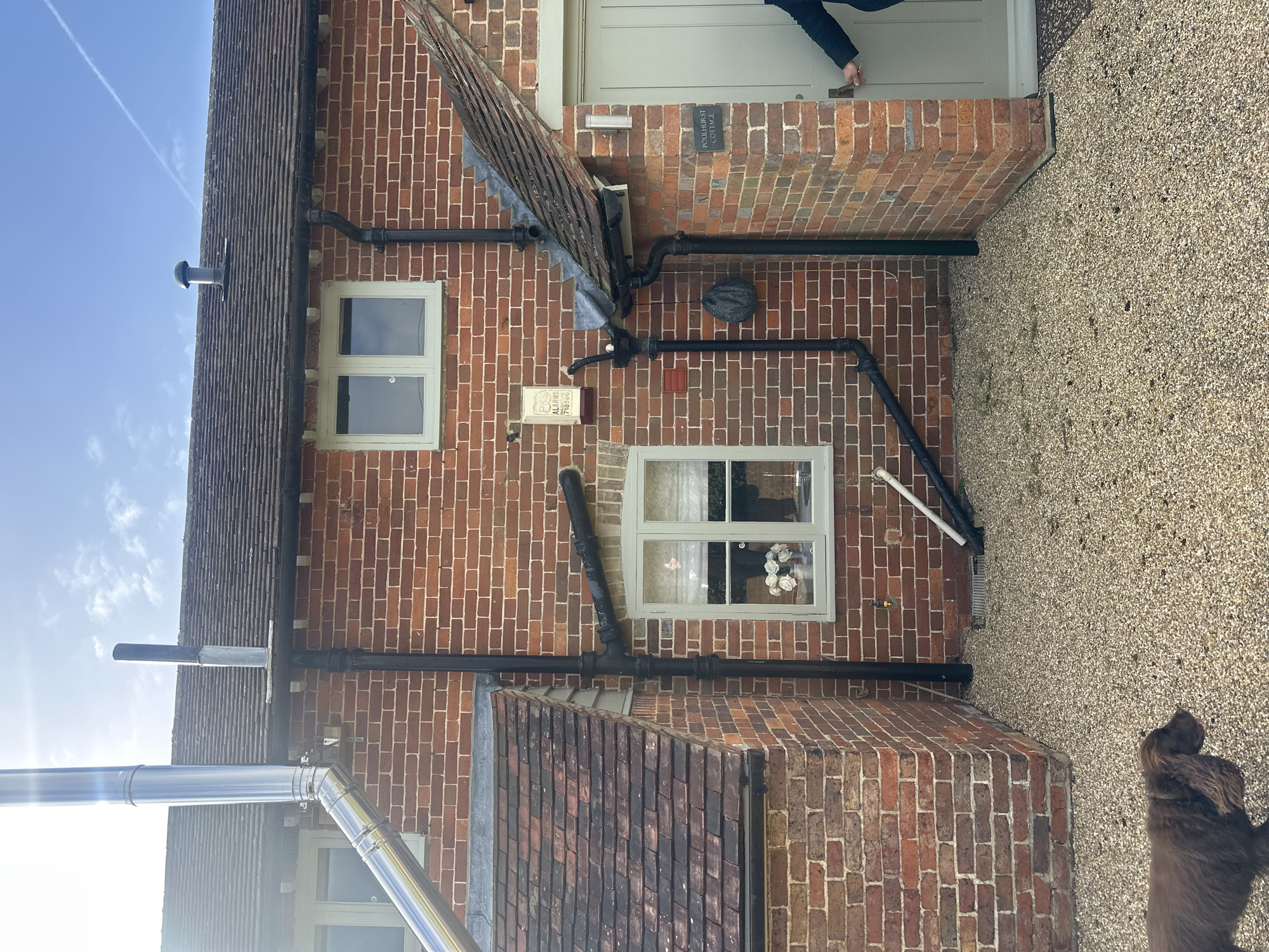 The image depicts the exterior of a red brick building under a blue sky. A window with white trim is visible on the front facade, reflecting light and revealing white flowers inside. Black pipes run along the exterior walls. A metal structure, possibly a weather vane, is positioned above the window. A person’s leg is visible entering the building through a light green door. A sign above the door reads "POULT-HURST COTTAGE". The ground next to the building is covered in gravel. A dog is present in the lower right corner of the image. Based on the text visible on the sign, the location is Tunbridge Wells, United Kingdom.