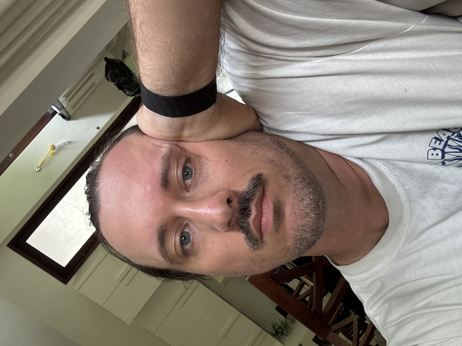 An adult male is depicted in a close-up, head-and-shoulders portrait within an indoor setting in Pecatu, Indonesia