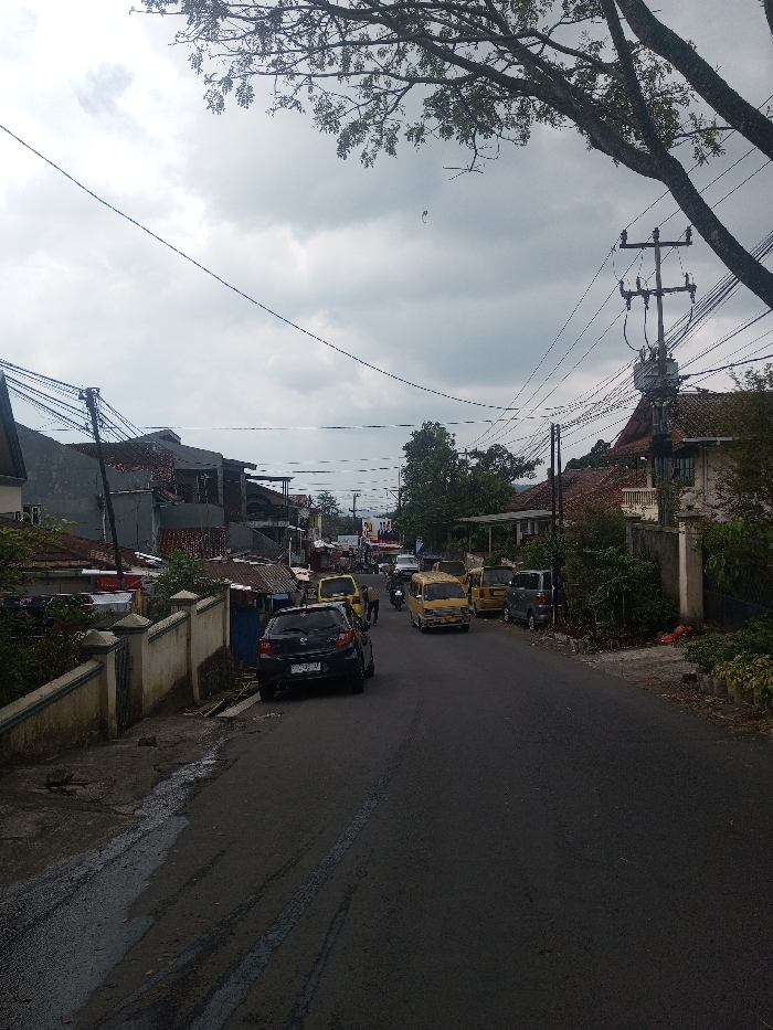 The image depicts a street scene in Kalchini, India. The setting is under an overcast, light gray sky. A paved asphalt road, displaying wet patches and distinct tire marks, extends from the foreground into the distance. On the left side of the road, a low concrete wall runs alongside a series of closely spaced buildings exhibiting varied construction, including exposed concrete and corrugated metal roofing. A dark-colored hatchback, with a partially legible license plate displaying "D 4241 JA", is parked on this side. Multiple black utility wires are strung across the street, connecting to poles on both sides. On the right side of the road, another concrete wall borders a building characterized by a reddish-brown tiled roof and lighter-colored walls, partially obscured by green foliage. A prominent utility pole equipped with a large grey transformer unit stands here, supporting a dense network of electrical wires. The roadway contains several yellow vans, consistent with commercial or public transport vehicles, with some parked and one appearing to be in motion further down the road. A single individual, dressed in a yellow garment, is partially visible near these yellow vehicles. A grey compact vehicle is parked further down the street on the right. A motorcycle is visible behind the dark hatchback, proceeding along the road. In the distance, additional vehicles and indistinct structures are visible, along with unreadable red and white commercial signage. Overhead, tree branches with green leaves extend into the upper frame from the right.