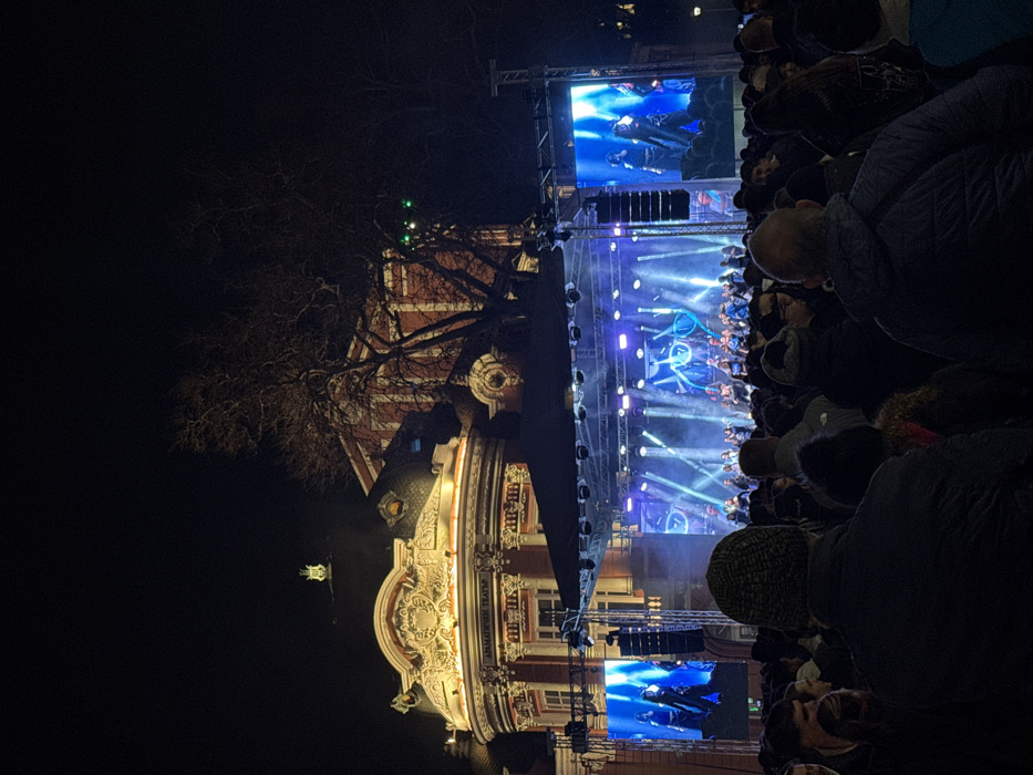The image displays an outdoor night scene in Varna, Bulgaria, in front of the Stoyan Bachvarov Dramatic Theatre. A large temporary stage, topped with a dark canopy, is positioned directly before the theatre. This stage is brightly illuminated by numerous blue and white spotlights, casting visible light beams and generating atmospheric haze. Two prominent LED screens flank the stage, each displaying a dynamic video feed featuring figures in dark attire. On the central stage, a group of approximately 20-30 individuals, appearing to be performers or a choir, is visible facing outwards towards an audience. The Stoyan Bachvarov Dramatic Theatre, an ornate historical building with classical architectural details, is illuminated by warm yellow exterior lighting. The inscription "ДРАМАТИЧЕН ТЕАТЪР" (Dramatic Theatre) is clearly visible above its central arch. A large deciduous tree with bare branches stands to the right of the theatre, partially obscuring its upper structure. A dense crowd of spectators occupies the foreground and midground, their backs mostly facing the camera, indicating they are observing the stage performance. Individuals within the crowd are dressed in winter or cool-weather clothing, with several observed wearing knitted beanies. The overall environment is that of a public outdoor event or concert at night.