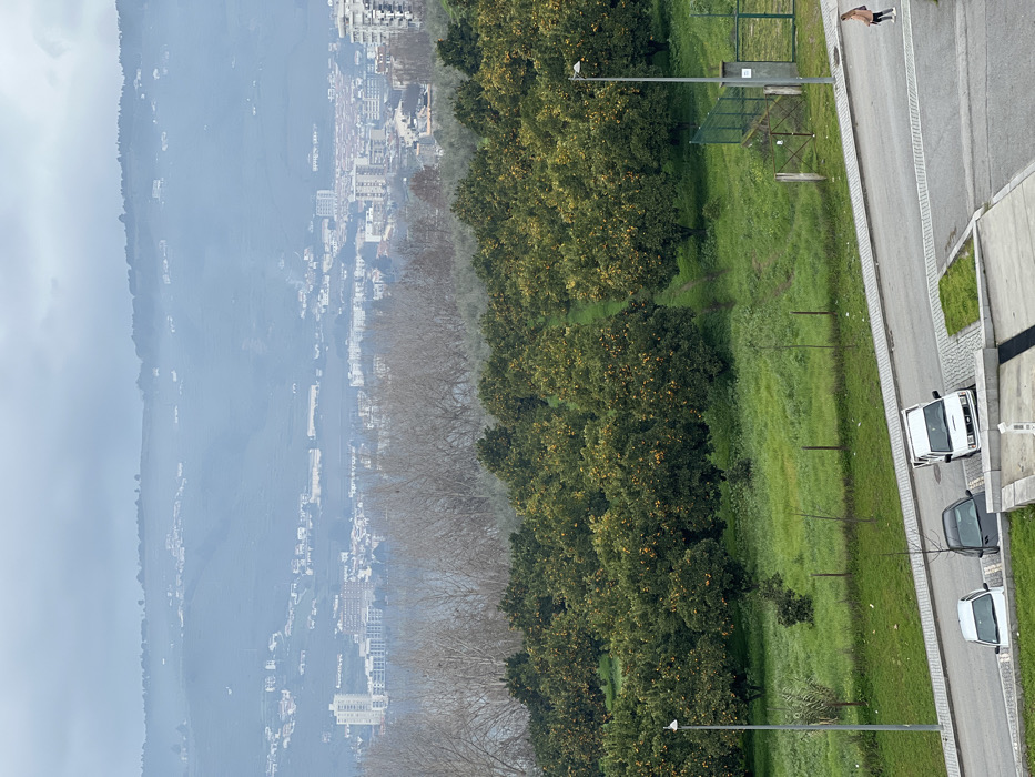 This image captures a panoramic view of Peso da Régua, Portugal, under an overcast sky with hazy distant visibility. The background features multiple layers of hazy, verdant hills, populated by scattered white residential structures. The city of Peso da Régua spreads across the mid-distance valley and lower slopes, characterized by a concentration of white and light-colored multi-story buildings, some appearing residential and others commercial. Sparse, bare deciduous trees are visible in the midground, suggesting a colder season, leading into a dense orchard of green citrus trees, heavily laden with visible yellow-orange fruit. The foreground is dominated by a sloped, bright green grassy area traversed by faint dirt paths that wind between rows of citrus trees. This green space is bordered on the right by a green wire mesh fence with a gate. A paved road runs horizontally across the lower portion of the frame. Three vehicles are parked parallel to the curb on the left side of the road: a white compact car, a dark compact car, and a white utility van with a roof rack. Two tall grey streetlights with white fixtures are visible, one on the far left and another near the fence on the right. On the far right side of the road, an individual, appearing to be an adult, walks away from the parked vehicles towards the right edge of the frame. The person is wearing light-colored clothing, including a tan long-sleeved top and white athletic shorts or pants, with bare arms. The immediate bottom right corner shows a partial view of a concrete or light-colored structural element, indicating the viewpoint is elevated above the road.