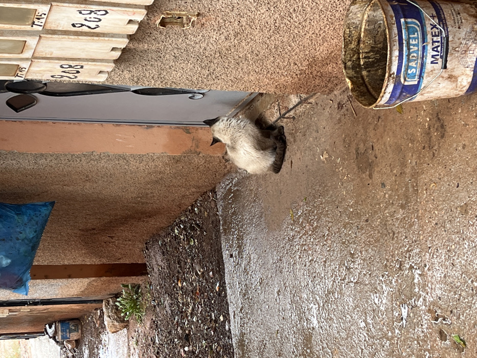 The scene depicts a narrow, wet outdoor passage in Ouaouizert, Morocco. A cream-colored domestic cat with dark brown points on its ears, face, paws, and tail sits hunched on the wet concrete ground in the mid-ground, facing and looking up at the base of a dark grey metal door with abstract ornamental cutouts. The cat's fur appears wet and somewhat matted. To the left of the door, a reddish-brown textured stucco wall stands beside a muddy patch of ground with scattered debris, a small cluster of green plants, and a light-colored rock. Further back, a blue utility bucket is partially visible, and a blue tarp or plastic bag hangs from an unseen upper structure. To the right of the door, a lighter beige textured stucco wall displays a row of horizontally mounted, light-colored boxes, possibly mailboxes or utility boxes, with the number "208" and text "T.15" visible on several units. A broken or empty fixture is present below these boxes. In the foreground on the right, a weathered and dented blue and white paint bucket, labeled "SADVEL MATEX," contains dirty liquid or refuse. The ground throughout the passage is visibly wet with standing water and reflections, indicating recent precipitation.