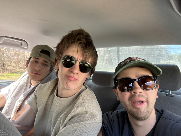Three young adult males are seated in the rear passenger compartment of a vehicle. The individual on the far left wears an olive green baseball cap backward and a light-colored t-shirt, with a light-colored towel draped over his left shoulder. The middle individual has brown hair, wears round reflective sunglasses, and a light-colored, textured short-sleeved shirt. The individual on the far right, appearing to take the photograph, wears a dark green baseball cap with a visible logo, dark rectangular sunglasses, and a dark t-shirt, with stubble on his face and his mouth slightly open. All three subjects are looking directly towards the camera. The vehicle's interior features grey fabric seats and a grey headliner. Through the vehicle's windows, bare deciduous trees and a roadside are visible, indicating an outdoor, daylight setting. The scene is situated in Micanopy, United States.