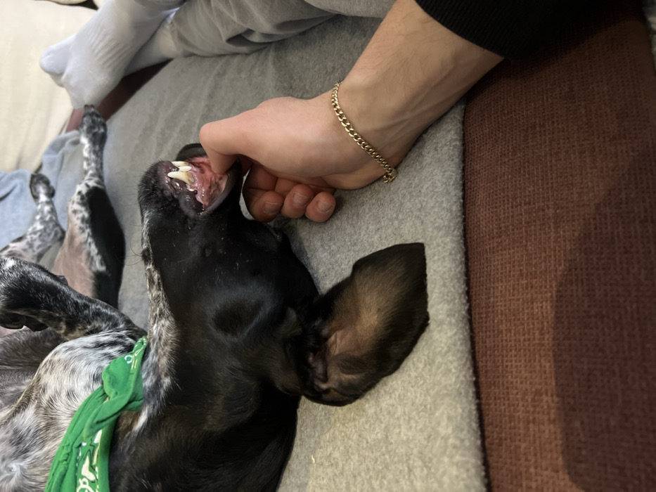 A black and white mottled dog, wearing a green bandana around its neck, lies on its back on a light grey, textured surface, possibly a blanket or cushion. Its dark, sleek underside is visible, along with a portion of its dark brown ear. The dog's mouth is open, revealing a row of sharp, white teeth, including prominent canines and incisors. A light-skinned human hand, adorned with a gold-colored cuban link bracelet on the wrist, gently makes contact with the inside of the dog's lower jaw near the gums. In the background, a human leg or foot covered by a white sock is partially visible under the same light grey fabric. A reddish-brown, coarse-textured surface occupies the lower portion of the frame, suggesting upholstery or carpet. The scene takes place indoors. The specific location within Varna, Bulgaria, is not discernible from the image.