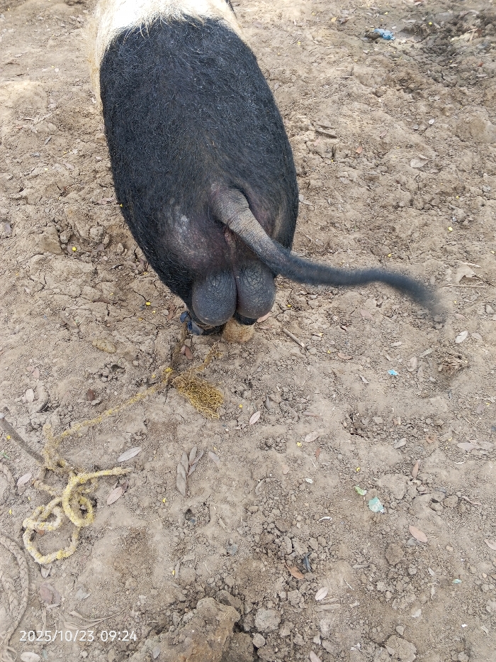 This image depicts a bicolored male pig, primarily black on its body and hindquarters with a white area visible on its upper back, standing on dry, light brown, cracked soil in Unguwan Rimi, Nigeria. The pig is viewed from a high angle, focusing on its posterior, which clearly shows its prominent testicles and a black, curly tail. A dark strap or restraint is visible around one of its lower hind legs. On the ground, a coiled yellowish rope is situated in the lower-left, and a clump of yellowish, fibrous material is directly behind the pig's hooves. Scattered dry leaves, small yellow particles, and a piece of light blue debris are also present on the soil. The scene is illuminated by overhead natural light, and a timestamp of 2025/10/23 09:24 is visible in the bottom-left corner. No human figures are present.