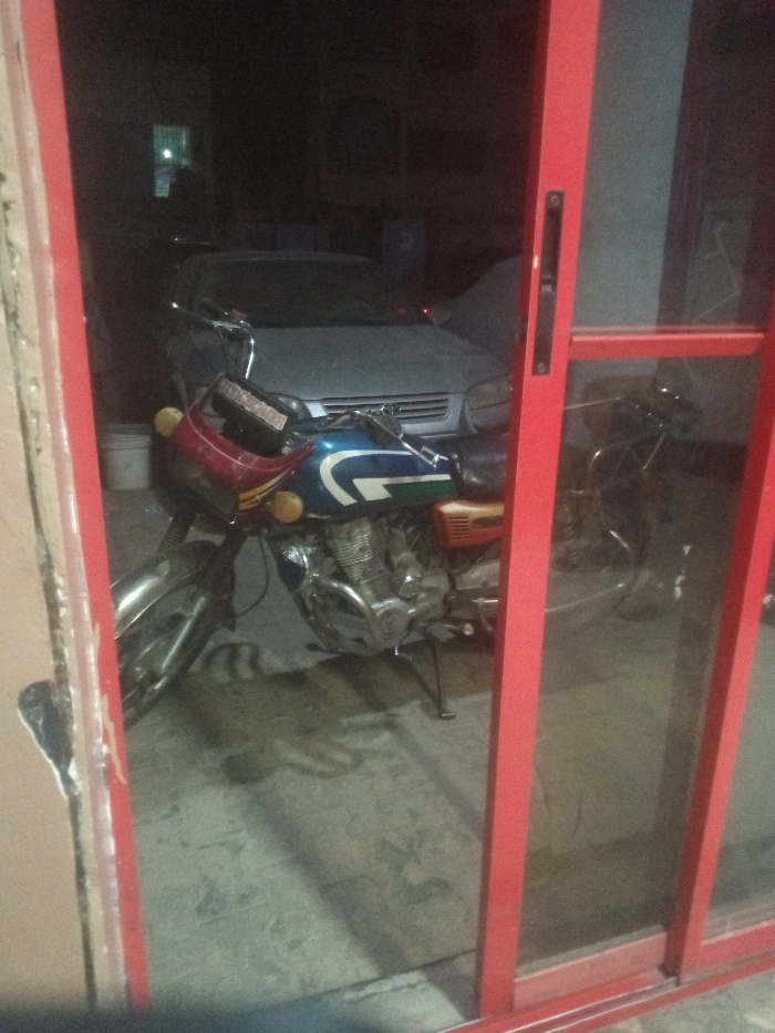 A motorcycle with a red and blue gas tank sits in front of a silver car in a dimly lit space. The motorcycle's front tire is visible, and its chrome engine components are partially obscured. The vehicle is viewed through a doorway with a bright red frame and glass. Part of another motorcycle is visible on the right side of the doorway. The space is possibly a garage or storage area.