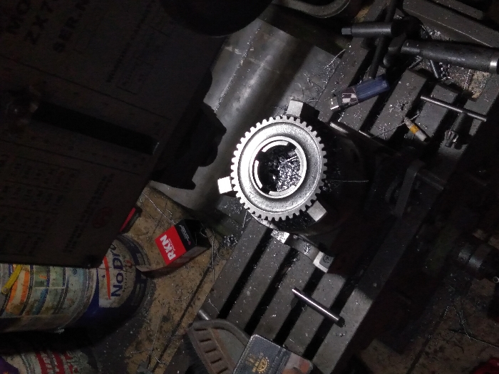 The image depicts a dimly lit, overhead view of a workshop environment, focusing on a metal machining operation. At the center, a dark metallic cylindrical component with an integral gear on its top rim rests on a T-slot machine table. Its central cavity contains a quantity of metallic shavings. The surrounding T-slot table surface is also strewn with metal shavings. Various tools and objects are scattered across the table, including a silver metallic rod to the left of the central component, and to its right, a blue and white disposable lighter, a chuck key, and several hex keys or similar small tools. In the background to the upper left, two stacked industrial buckets are visible, the lower one prominently displaying "NoPro" on its label. A small red box, labeled "RKN MOTOR," is situated on the floor or a lower surface behind the central component. To the upper right, a large piece of industrial machinery, possibly a milling machine, is partially visible, displaying a data plate with "MODEL ZX70..." and "SER. N..." No individuals are present in the scene. The specific location within the city of Río Grande, Mexico, cannot be determined from the visual information provided.