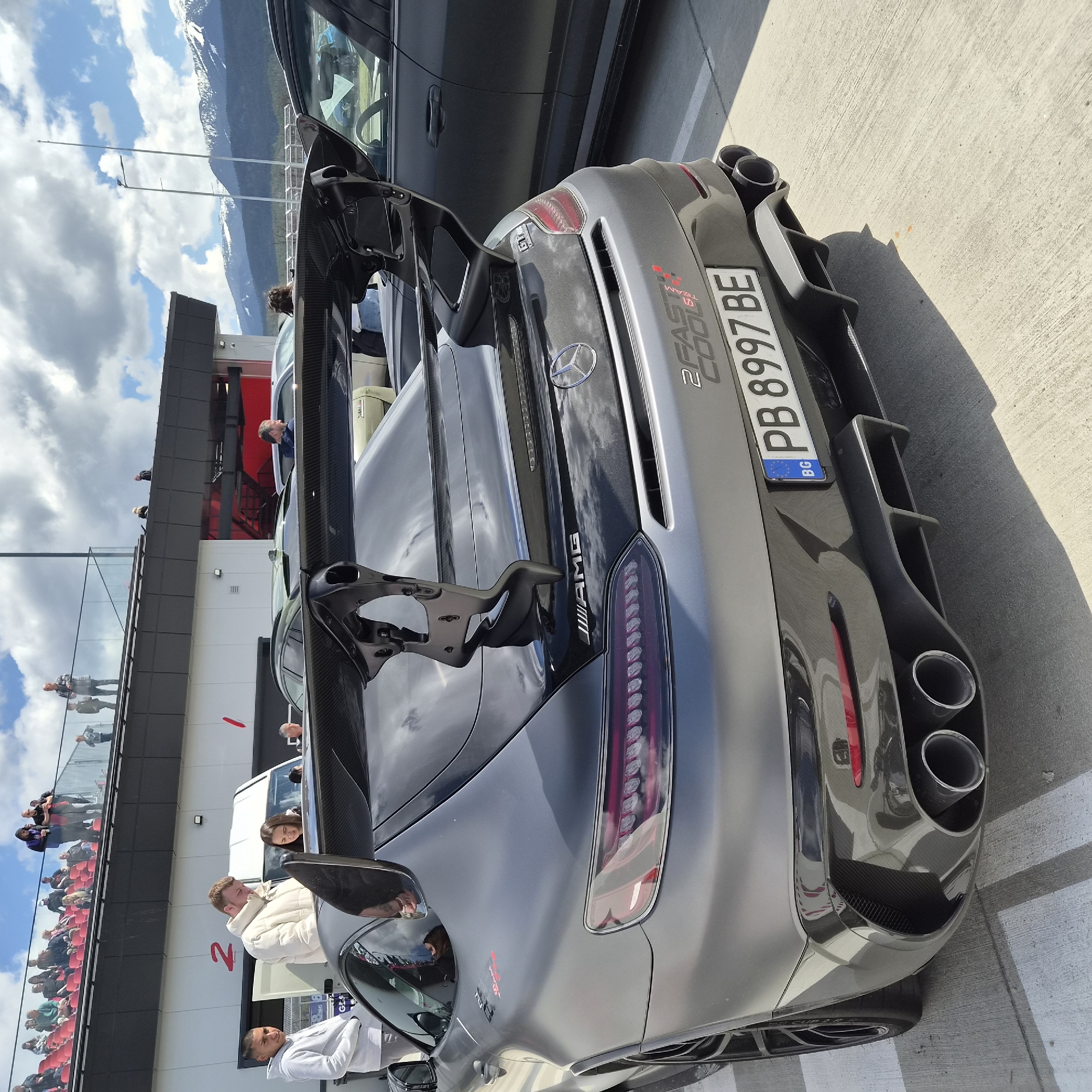 rear of a gray Mercedes-AMG car parked on a concrete surface, with the rear wing prominently displayed. The license plate reads "PB 8997 BE" and indicates that the car is registered in Bulgaria. The words "2FAST2COOL TEAM" are visible as a sticker on the car. In the background, there's a building with people looking over a railing, a crowd seated in red chairs, and mountains in the distance. The scene appears to be at a racetrack or motorsports event. Based on the provided information that the location is Samokov, Bulgaria, the mountains are likely part of the Rila mountain range. People are standing around the car, some looking at it, suggesting they are observing or admiring it. There is another car parked next to the AMG.