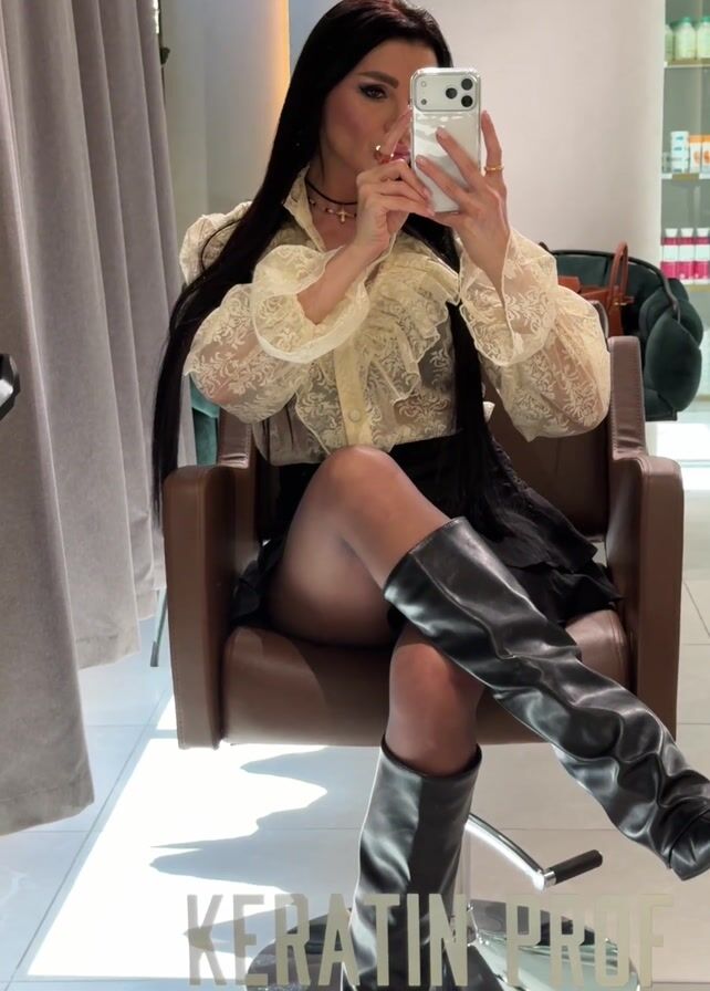 A woman with long, straight black hair is taking a selfie with her smartphone. She is sitting in a brown leather salon chair, legs crossed, wearing high, shiny black leather boots, a short black skirt, and a lacy beige blouse. She is wearing makeup, a choker necklace and rings. A curtain is visible on the left side of the frame, and a product display and furniture are in the background. "KERATIN PROOF" is superimposed on the bottom of the frame.