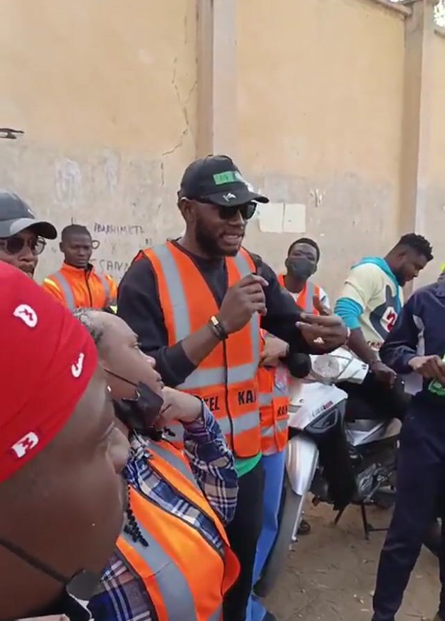 A man wearing a black baseball cap, sunglasses, and an orange traffic vest labeled "RATEL KA" is speaking into a microphone to a group of people. Several individuals are wearing similar orange vests. The man is gesturing with his hands as he talks. The group is standing outside next to a wall that has some graffiti on it. A silver scooter is parked behind the group. Some individuals are drinking from plastic bottles.