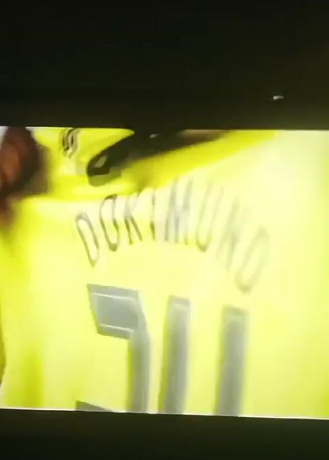 TV screen playing a report about a soccer player. The video begins with a man sitting at a table with a laptop and a coffee cup. Two other men stand behind him. The video then cuts to a close up of a yellow soccer jersey with "DORTMUND" and the number "24" on the back. The next shot shows a man in a suit standing in a stadium holding the same jersey. The video then shows the same man wearing the jersey, standing in front of the empty stands of the stadium. The last shot shows the man dribbling a soccer ball through cones on a field.