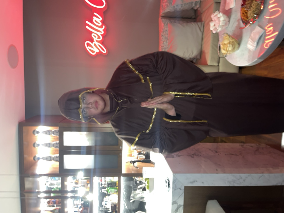 This image, captured indoors in Mexico City, Mexico, features a single youthful male individual standing centrally, facing directly towards the camera. He wears a dark brown hooded robe with gold trim along the hood, sleeves, and front, consistent with a monk or wizard costume. His hands are pressed together in front of his chest, palms touching, fingers extended upwards in a prayer-like or meditative gesture. His facial expression is neutral. To the subject's left, a fully stocked bar area is visible, featuring glass shelves holding various liquor bottles illuminated from behind or above. A light-colored, possibly marble, bar counter extends from this setup, with a few items, including what appear to be lime wedges, on its surface. To the subject's right, a lounge area is present, including a light-colored sofa adorned with multiple pillows. In front of the sofa, a circular, light-colored table displays two clear glass bowls—one containing yellow chips or crisps, the other filled with white marshmallows—and a small, decorative red dish holding noodles or a similar snack, along with white napkins. A red neon sign mounted on the wall above the sofa partially displays the text "Bella C". A circular ceiling fixture is visible in the upper right. The environment appears to be a private residence or an upscale commercial lounge.