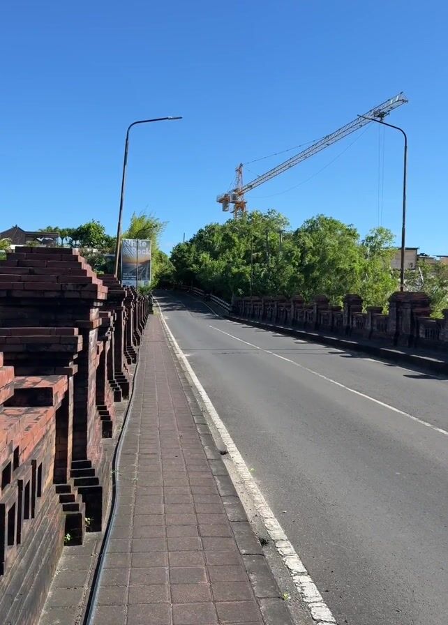The video depicts a straight asphalt road viewed from the side of a brick walkway. A white dividing line runs along the center of the road. On either side of the road, low brick walls act as barriers. Street lamps stand tall on both sides. In the background, lush green trees and a construction crane are visible against a clear, blue sky.