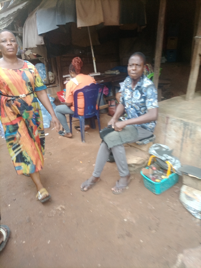 Three people are in an outdoor setting. A woman wearing a colorful dress with a black belt walks on the left. A second woman sits in a blue plastic chair wearing an orange shirt. A man wearing a patterned button-up shirt and grey pants sits on a stone or concrete block. A blue plastic basket with assorted items sits to his right. The ground is red dirt. A building is partially visible behind them.