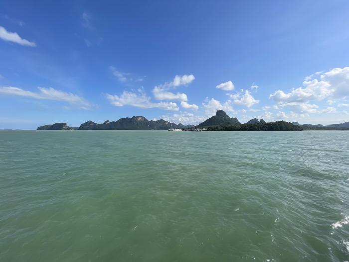 The image presents a wide-angle view of a coastal seascape looking towards the landmass of Don Sak, Thailand, under a clear blue sky with scattered white cumulus clouds
