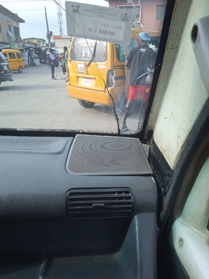 The image depicts an urban street scene in the city of Animashawun, Nigeria, viewed through the cracked windshield of a stationary vehicle