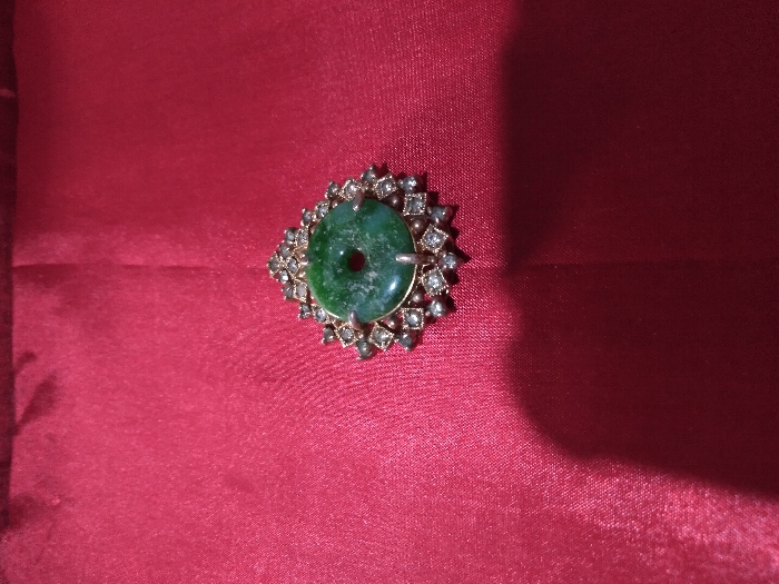 A single ornate piece of jewelry rests on a vibrant red textile surface. The central element of the jewelry is a circular, flat, dark green jade disk, approximately 2.5 cm in diameter, featuring a central perforation roughly 0.5 cm in diameter. This jade is held within an elaborately shaped, antique-style metal setting, appearing gold-toned. The setting is adorned with numerous small, clear, round faceted gemstones, each estimated at 1-2 mm in diameter, arranged in a starburst pattern around the jade. Additionally, smaller, dark spherical beads, approximately 1 mm in diameter, are interspersed within the metalwork. The entire piece of jewelry measures approximately 4 cm in length and 3.5 cm in width. The supporting surface is a deep red fabric with a noticeable sheen, exhibiting several soft folds and creases. A large, indistinct, dark shadow is cast across the lower right portion of the fabric, suggesting illumination from the upper left. This scene is located in Ciherang, Indonesia.