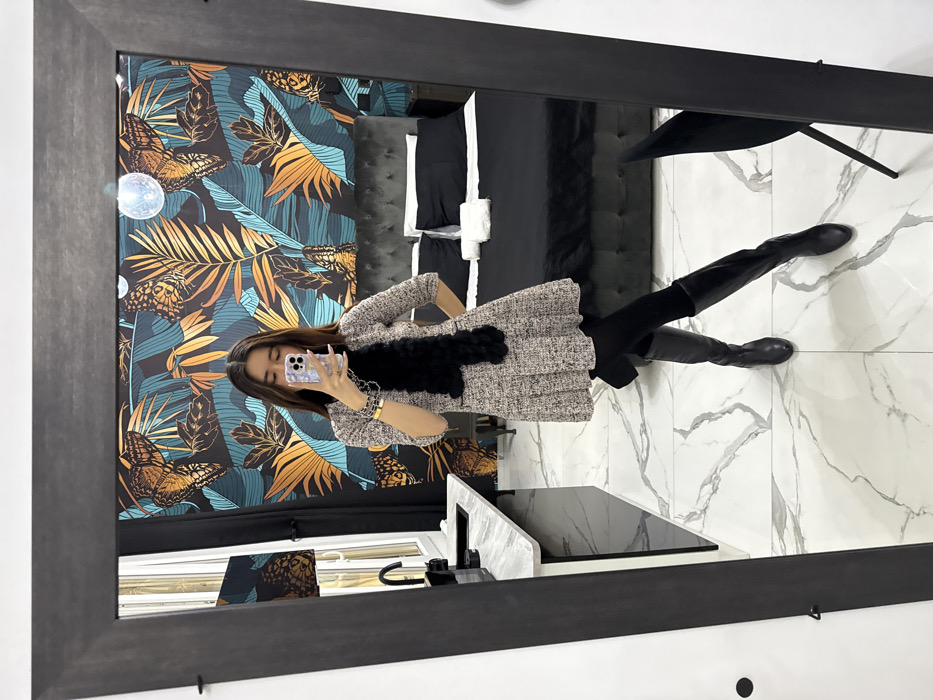 The image depicts a female subject taking a mirror selfie within a modern interior room. The specific location within the city of Florence, Italy, is not identifiable from the visual evidence. The central figure is a young adult female, reflected from the waist up, with long dark hair. She wears a beige and light brown tweed-patterned mini-dress with three-quarter sleeves, a black faux fur scarf, black opaque tights, and black knee-high boots. Her left wrist displays multiple silver-toned bracelets, and she wears rings on her fingers. She holds a light purple smartphone with a patterned case (possibly butterfly motif) in her right hand, pointed towards the mirror to capture the reflection. Her left hand rests on her hip. The room's interior features a prominent wall covered in tropical-themed wallpaper with large teal and orange leaves and butterfly patterns against a dark background. The flooring consists of glossy white tiles with grey marble-like veining. In the background, a large bed is visible with a dark grey, tufted velvet headboard and black bedding, including pillows and sheets. Two small, white folded towels are placed neatly on the bed. Above the bed, a round, moon-like hanging light fixture is suspended. To the left, a dark-colored vanity or counter unit with a black faucet and sink is present. Dark curtains are visible behind the vanity. A dark chair with a thin frame is partially reflected on the lower right. The entire scene is framed by a large, rectangular mirror with a thick, dark frame.
