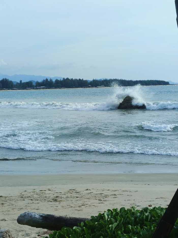 This forensic description details a coastal scene in Meunasahbale, Indonesia. The image depicts a wide view of a sandy beach transitioning into the ocean under a pale blue sky. In the immediate foreground, a light tan sandy beach occupies the lower third of the frame. A weathered, grey-brown log lies horizontally on the sand, extending from the lower-left edge towards the center. To its right, a dense patch of broad-leafed green vegetation, resembling Ipomoea pes-caprae, grows along the bottom right corner, partially obscured by a dark, vertical element on the far right. The midground is dominated by the ocean, characterized by multiple parallel waves. The water exhibits a light blue-green hue. A large, dark grey rock formation is situated in the water, slightly right of the frame's vertical center. A significant wave is captured breaking directly against this rock, creating a forceful white spray and foam plume that rises vertically and spreads horizontally. Additional white-capped waves are visible closer to the shoreline and further out. The background reveals a distant coastline stretching across the horizon. A dense band of dark green trees lines the shore, behind which faint, hazy blue mountains are visible. A few indistinct structures are discernible among the trees along the distant beach. The sky overhead is a uniform, light blue with no distinct cloud formations. No individuals or direct human activity are observable within the frame.