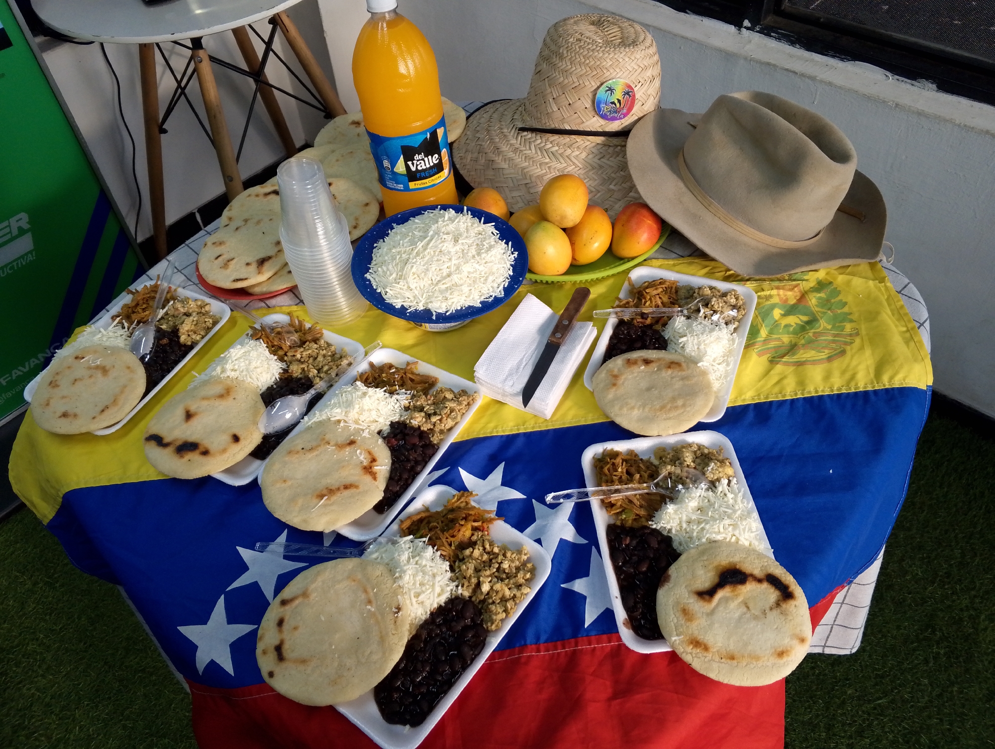 The image depicts a table laden with food items associated with Venezuelan cuisine, set against the backdrop of the Venezuelan flag