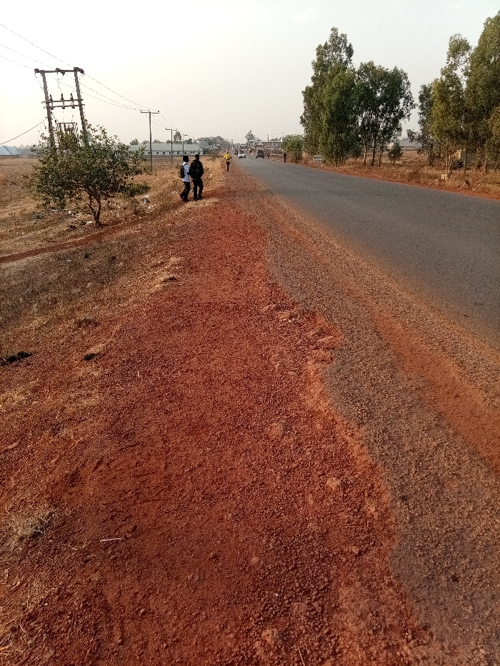 The scene depicts an outdoor roadside environment in Durimi, Nigeria. The foreground and left shoulder consist of reddish-brown, dry, gravelly soil with sparse patches of dry, yellowed grass. A two-lane paved road, dark grey in color, extends diagonally from the mid-right into the distance towards the center-left. On the left shoulder, in the mid-ground, three individuals are present. Two men are standing close together, appearing to converse; one wears a light-colored long-sleeved shirt, dark pants, and carries a light-colored backpack, while the other wears a dark jacket and dark pants. Further down the roadside, a third individual in a yellow shirt and dark pants walks away from the camera. A large utility pole structure with crossarms and multiple power lines stands on the left side, behind the two conversing men. Beneath this structure, a small green-leafed tree is visible. In the background to the left, several white-walled buildings with dark roofs are discernible. The right side of the paved road is bordered by a line of tall, green-leafed trees. Multiple vehicles and additional indistinct human figures are visible on the distant road surface. The sky overhead is a uniform pale, hazy white.