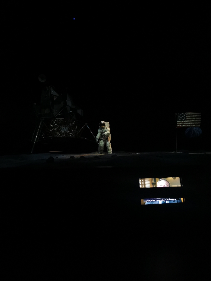 An astronaut stands on the moon's surface near the lunar lander. The American flag waves in the distance. Above the scene, a small blue point could represent Earth in the black sky. In the foreground, a screen displays a man's face and subtitles. The overall scene evokes the historical lunar landing, possibly a museum display.
