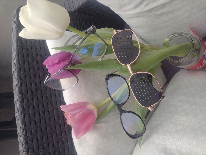 The image displays an outdoor arrangement of three pairs of eyeglasses and three cut tulips. The scene is set on a light-colored, patterned pillow, which rests against a dark grey or black woven surface consistent with outdoor wicker or rattan furniture. Specific details include: - **Eyeglasses:** Three distinct pairs are present. One pair features clear frames and lenses. Another pair has black frames and lenses exhibiting a light blue anti-reflective coating. The third pair, framed in a gold-colored metal, is a pinhole-type with black opaque lenses perforated by multiple small, circular holes. The glasses are placed on and between the tulip blossoms and stems, and on the pillow. - **Tulips:** Three tulips are visible: one light pink blossom to the left, one purple blossom in the center, and one white blossom to the right. Their green stems are gathered at the base and appear to be placed in a clear glass jar with a partially visible red and white label, situated at the bottom right of the frame. - **Support:** The tulips and eyeglasses are predominantly supported by a light grey or white pillow with a subtle textured pattern. - **Environment:** The background consists of dark grey or black woven material, indicative of outdoor furniture. The scene is brightly lit, suggesting natural daylight. No individuals are present. The image provides no visual cues or specific markers to confirm the location as the city of Burgas, Bulgaria, beyond being an outdoor residential or patio setting.