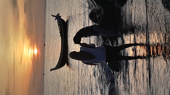 This image displays a coastal scene in Lhokseumawe, Indonesia, during either sunrise or sunset. In the foreground, two individuals are standing at the water's edge. The person on the left, facing away from the camera, wears a head covering, a light-colored long-sleeved top, and a dark skirt, with her lower legs and feet submerged in the water. She holds a small, dark object, consistent with a smartphone, up towards the face of the second individual. The person on the right is partially bent forward, wearing a dark top and lighter pants, and is positioned near a cluster of dark rocks at the water line. In the middle ground, a traditional wooden boat with an ornate, upward-curving prow and stern floats on the calm water, silhouetted against the horizon. Several smaller, indistinct vessels are visible further out on the water. The sky is dominated by warm orange and yellow hues from the low-hanging sun, which casts reflections on the rippled surface of the water.