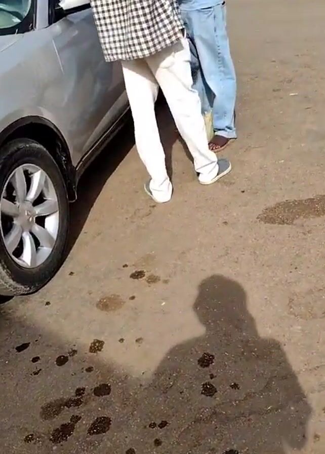 Two men are exchanging cash near a parked silver car. The man on the left wears a black and white checkered shirt and white pants. The man on the right wears a light blue t-shirt and light blue jeans. The man in blue is holding a stack of bills and appears to be counting them. The man in the checkered shirt is looking at the money he is receiving. They are standing on an asphalt road with oil stains. Other cars are parked nearby. A street sign and a building can be seen in the background. A shadow is cast by the person filming the scene.