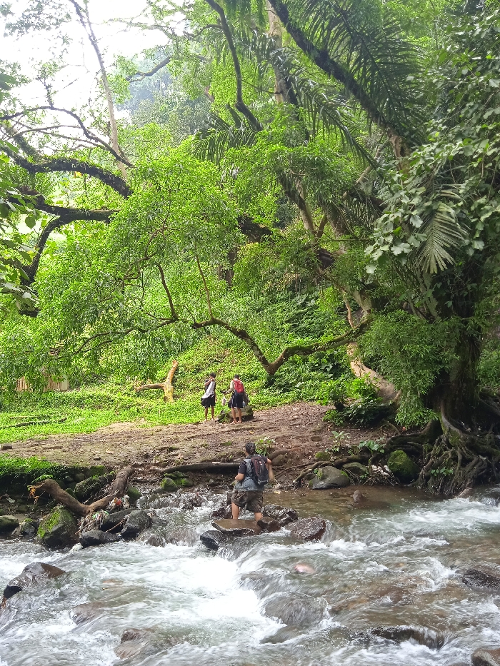 small river running through a lush, green jungle in the Kecamatan Tawangmangu district of Indonesia, located at coordinates -7.656 latitude and 111.135 longitude. Four people are present. Three stand on the riverbank to the left of the image, while one is standing in the shallow water of the riverbed. The person in the river is a man wearing a grey shirt, blue shorts, and a backpack. The three people on the bank are facing the river. They are all adults and are wearing casual clothing. The riverbed is rocky and the water is white and foamy. The jungle is thick and green, with many trees and plants. The riverbank is covered in rocks and tree roots.