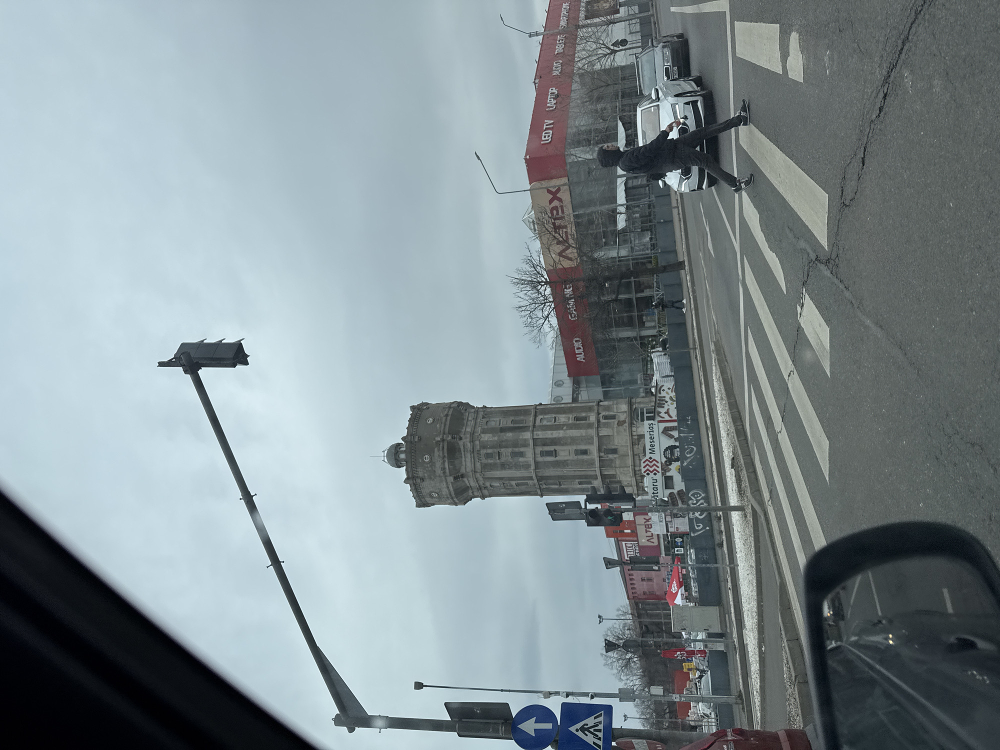 The image depicts an urban street scene in Bucharest, Romania, centered on the Cotroceni Water Tower. The vantage point is from inside a vehicle, with portions of the car's interior visible in the upper-left and a side-view mirror reflection in the lower-left. The sky is overcast, and patches of snow are present on the road median and near the pavement, indicating cold weather. In the mid-ground, the Cotroceni Water Tower, a multi-story, circular stone structure with a domed top and small, recessed windows, stands prominently. Its facade shows weathered stonework. Adjacent to and behind the tower, a large commercial building, identified by "Altex" signage, is undergoing visible renovation or construction, with large red tarpaulins covering sections and displaying product categories such as "LED TV," "LAPTOP," "AUDIO," and "GAMING." Construction barriers and equipment are visible around this site. In the foreground, a multi-lane asphalt road features a white zebra crossing. Surface cracks are visible on the road. A male subject, wearing a dark hooded jacket, dark pants, and dark sneakers with white soles, is mid-stride crossing the zebra section from right to left. Behind him, a white sedan is stopped or slowly moving, and a dark sedan is further back. On the left, a tall metal pole supports a horizontal arm with a traffic light showing a green signal. Below it are a blue circular sign with an upward white arrow and a blue square sign with a white pedestrian crossing symbol. Additional streetlights and bare-branched trees are scattered across the scene.