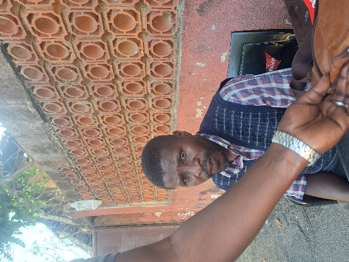 An outdoor scene in Jos, Nigeria, features an adult male seated against a decorative red brick wall under bright daylight