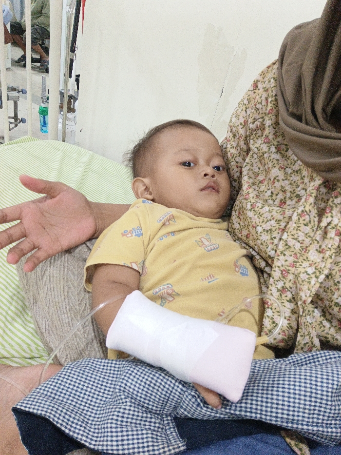 This image captures an infant being held by an adult within a hospital room in the city of Margorejo, Indonesia. The infant, positioned centrally, has light skin, dark hair, and wears a yellow t-shirt with small patterned motifs. The infant's left arm is secured with a white padded wrap and medical tape, from which a clear intravenous (IV) line originates and extends upwards. The infant's gaze is directed towards the right side of the frame. The adult holding the infant is partially visible, wearing a brown headscarf, a floral-patterned garment with a light background, and blue and white checkered pants. The adult's open left hand rests near the infant. The background consists of a light-colored wall, showing minor surface imperfections, and glimpses of medical equipment, including a metal stand and a blue-capped medical container. A green and white striped pillow or mattress pad is visible beneath the infant.