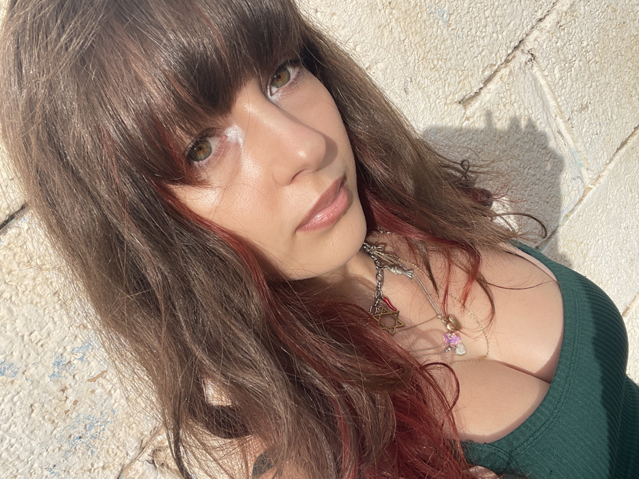 A fair-skinned woman with brown hair and red highlights poses outdoors in a green ribbed tank top. She wears multiple necklaces with pendants, including a Star of David. Her makeup includes glossy lips and a light shimmer on her eyelids. Light reflects strongly off her left eye socket. The background features a textured, light-colored wall.