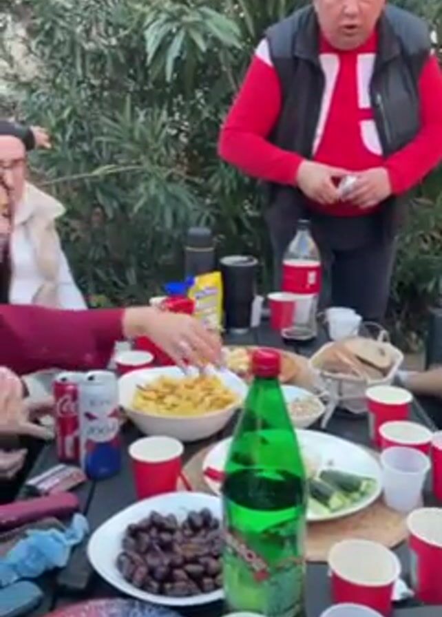 A group of people are gathered around a black outdoor table laden with food and drinks. A man in a red shirt and a black vest is the focal point, standing near the table and holding something in his hands. The table is covered with various items including plates of dates, cucumbers, chips, bread, bottles of Coca-Cola and sparkling water, cups, and condiments like ketchup and mustard. Other people are seated around the table, interacting with each other and the food. Some are reaching for items on the table, while others are talking and gesturing. The background consists of green foliage, suggesting the gathering is taking place in a backyard or outdoor setting.