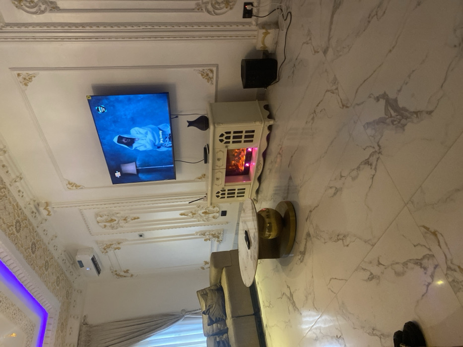 An interior view of a contemporary living room in Galadimawa, Nigeria, features a white aesthetic with gold accents. The walls are white, adorned with elaborate gold molding and decorative panels. A white ceiling exhibits intricate gold molding and a recessed strip of purple LED lighting. A large, wall-mounted flat-screen television displays an image of a person in a white hooded garment standing next to a floor lamp against a blue background, with "Big Daddy" text visible. Beneath the television is a white console table incorporating an electric fireplace that emits artificial flames and a pink glow. A dark decorative vase rests on the console. To the left, a light brown sofa with matching throw pillows is positioned near a window covered by light-colored curtains. In the foreground, an oval coffee table with a white marble top rests on a gold base featuring a prominent spherical element. A black remote control is visible on the coffee table. The floor is covered with polished white marble tiles displaying grey veining. A black columnar speaker stands on the floor to the right of the console, near electrical outlets and visible cords. A pair of dark slippers is partially visible on the floor in the bottom left corner. An air conditioning unit is mounted on the wall above the sofa.