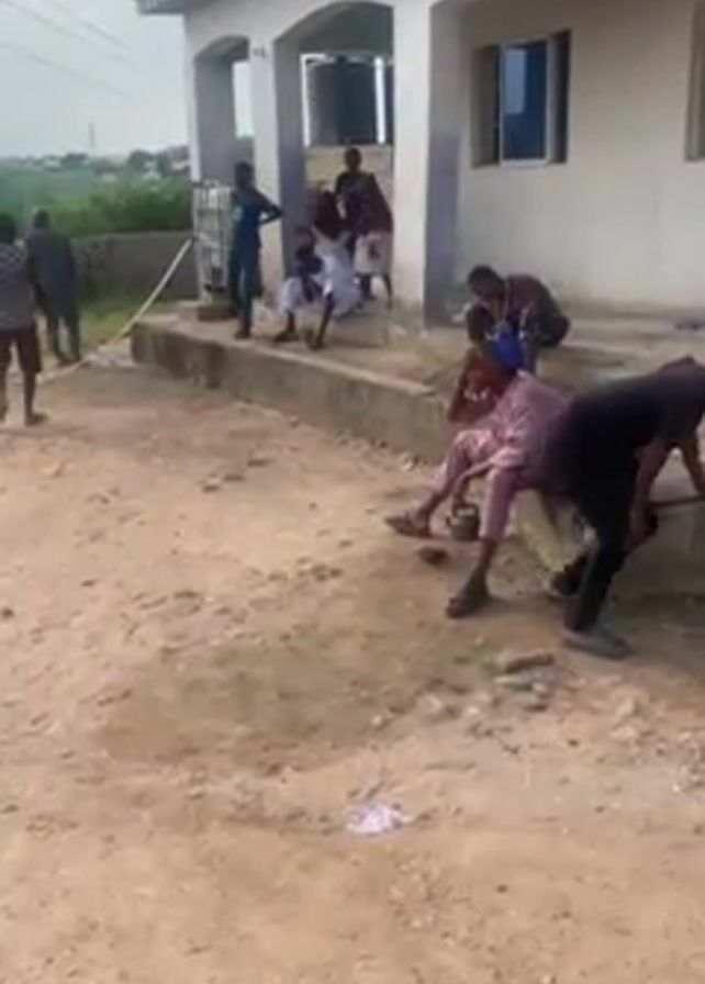group of young people gathered outside a small, light-colored building. Some are sitting on the building's steps, while others are standing or walking around. A large white plastic water tank sits behind the building. The ground is dirt and gravel. In the background, there are glimpses of vegetation and other buildings. The sky is cloudy.