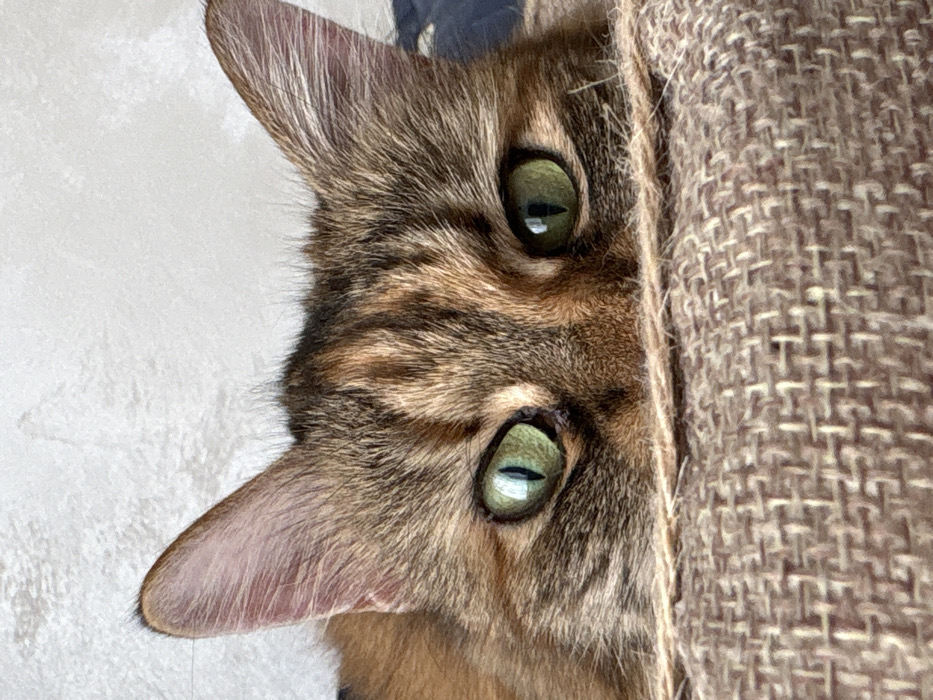 A domestic cat, exhibiting a tabby fur pattern with shades of brown, black, and ginger, is observed in a close-up, head-on view. The cat's striking green eyes, with vertically slit pupils, are prominent as it appears to be peeking over a textured, woven material, possibly a blanket or cushion, of a light brown or beige color. Only the upper portion of the cat's head, including its ears, forehead, and eyes, is visible above this foreground object. The ears are pointed and proportionate. The background is an out-of-focus, light-colored surface, possibly a wall or soft furnishing, providing minimal contextual detail. The specific location in the city of Bar, Montenegro, cannot be determined from the visual information provided within the image.
