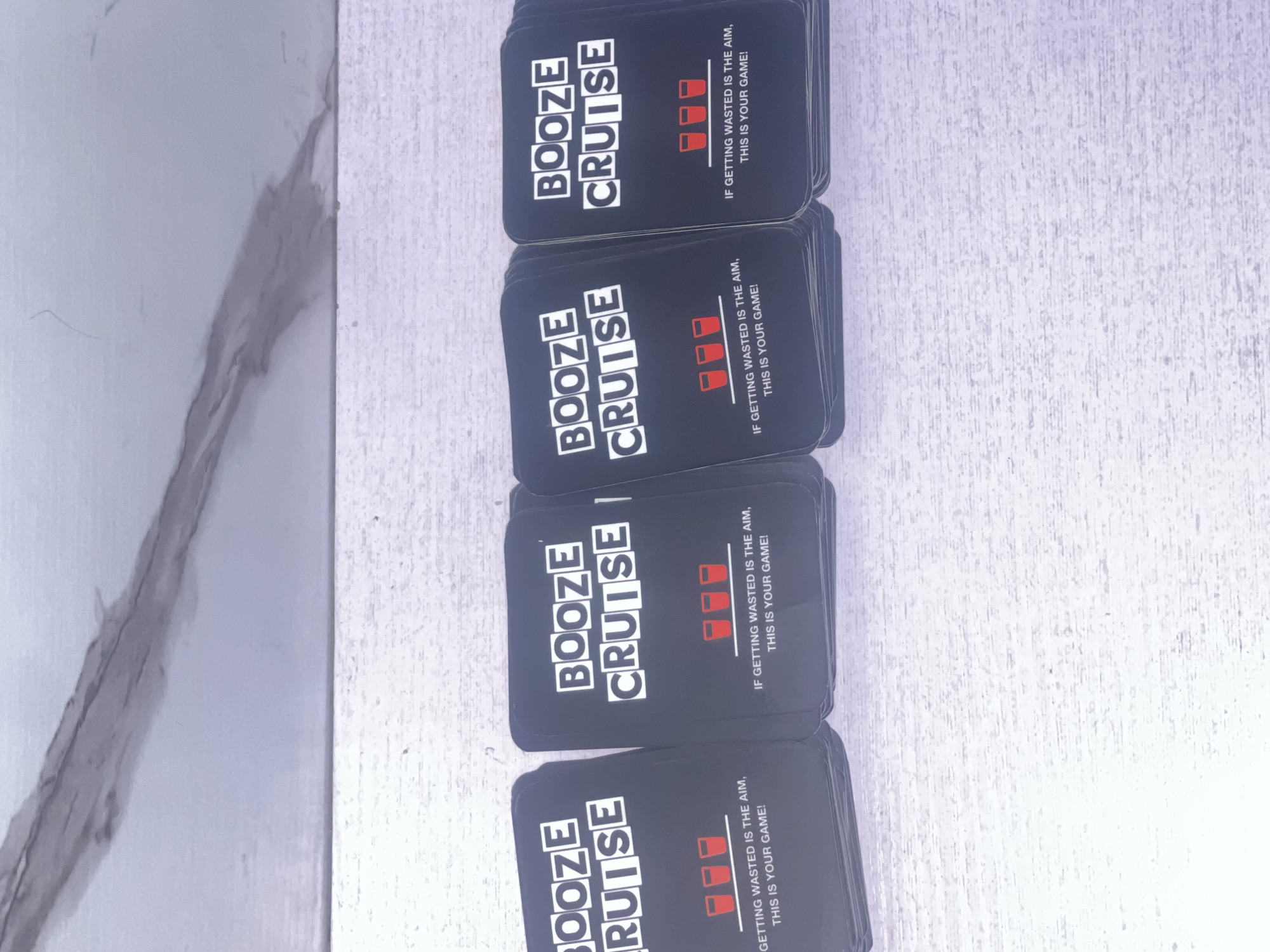 four stacks of black cards with the words "BOOZE CRUISE" printed in white, stacked on a surface that appears to be a white, textured countertop
