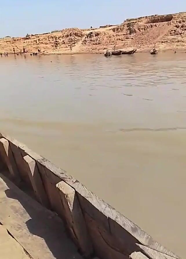 The view is from the side of a wooden boat moving on a wide, calm, and murky river under a clear, light blue sky. The shore is visible in the distance, a sandy embankment with some rocky outcroppings. On the shore, there are a few small boats and people are visible, some appearing to be standing in the water. The boat's wooden railing fills the lower portion of the frame, casting shadows on the deck.