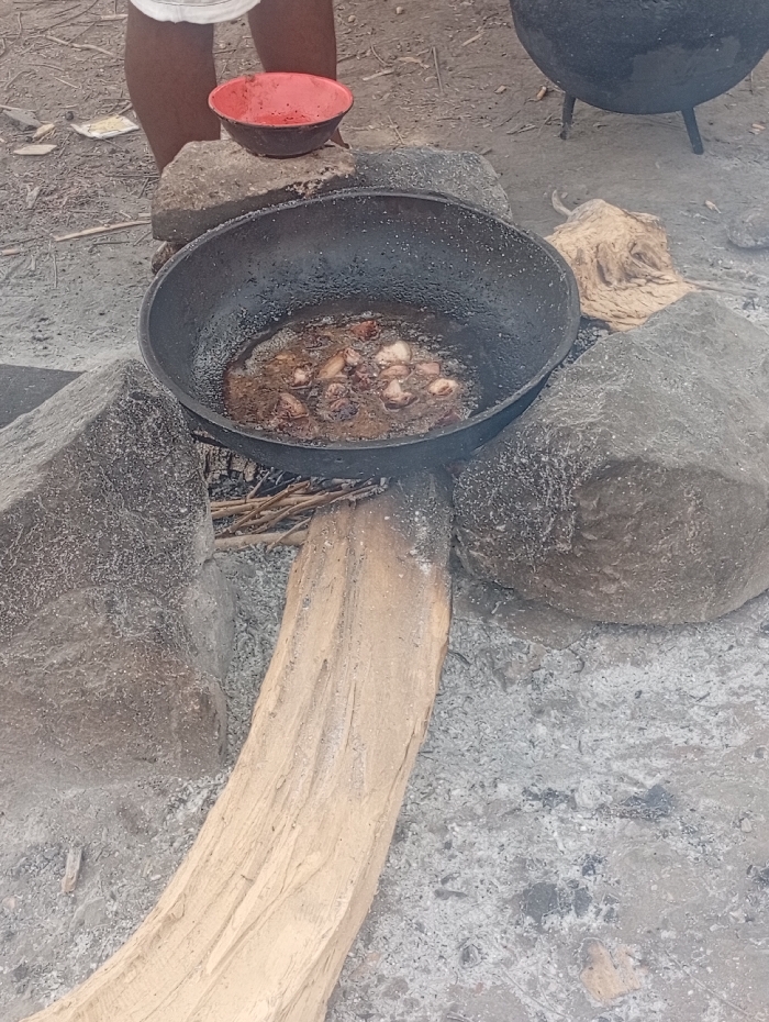 The scene is a cooking fire in the city of Assai Sabongida, Nigeria, located at coordinates (latitude: 8.864, longitude: 8.442). A large cast iron pot sits on top of three rocks. There is a wooden log underneath the pot and a red bowl is sitting next to the pot. The pot is filled with hot oil and what appears to be pieces of meat. The fire has died down and there are ashes and embers around the pot. The ground is uneven and dirt. There are pieces of twigs and sticks scattered throughout the scene. There are no people visible in the image.