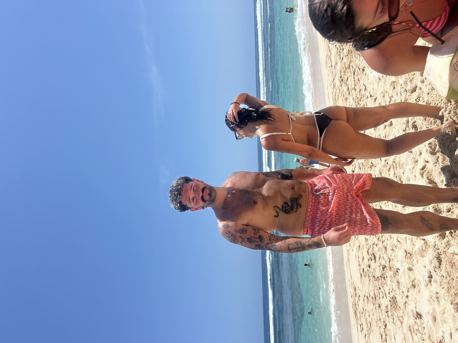 The image depicts a sunny beach scene in Ungasan, Indonesia, under a clear blue sky. In the foreground, a shirtless male subject stands facing the camera, positioned slightly left of center. He has short curly dark hair, a mustache, and visible tattoos on both arms and his torso, including a prominent tiger design on his stomach. He wears red and white patterned swim shorts, an earring, and a necklace. To his right, a female subject stands with her back partially to the camera, looking out towards the ocean. She has dark hair, wears a white bikini top with dark thong-style bottoms, and her right hand is near her head, possibly adjusting her hair or sunglasses. In the bottom right corner, a second female subject is partially visible, oriented downwards, wearing sunglasses and a pink and white striped bikini top. She holds a green coconut with a straw. The background features a wide expanse of light-colored sand meeting clear blue-green ocean water with visible waves. Several other individuals are present in the distant background, both in the water and on the sand.