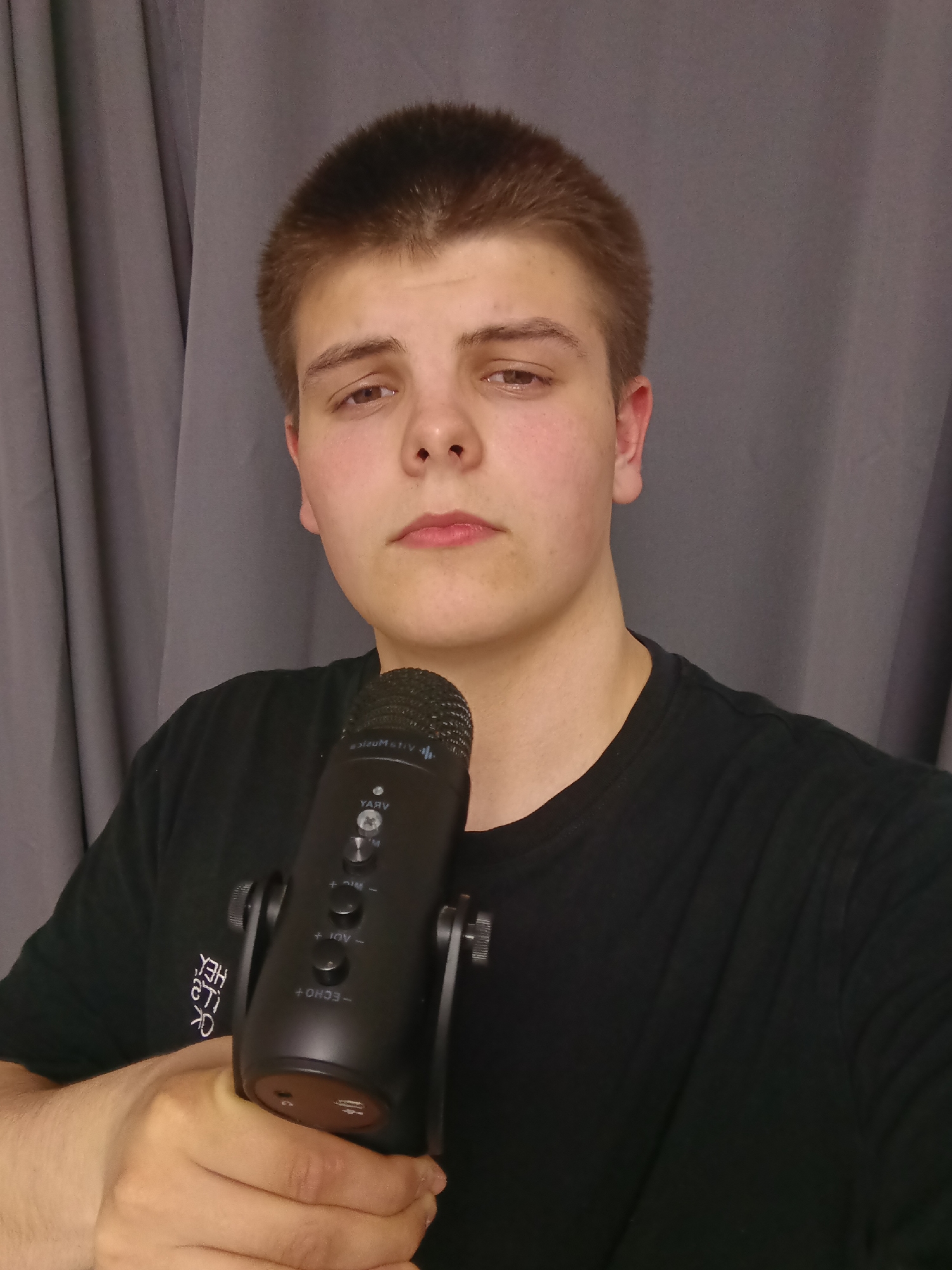 A young man with short brown hair is holding a black microphone in his right hand, posing for a selfie or video in front of a gray curtain
