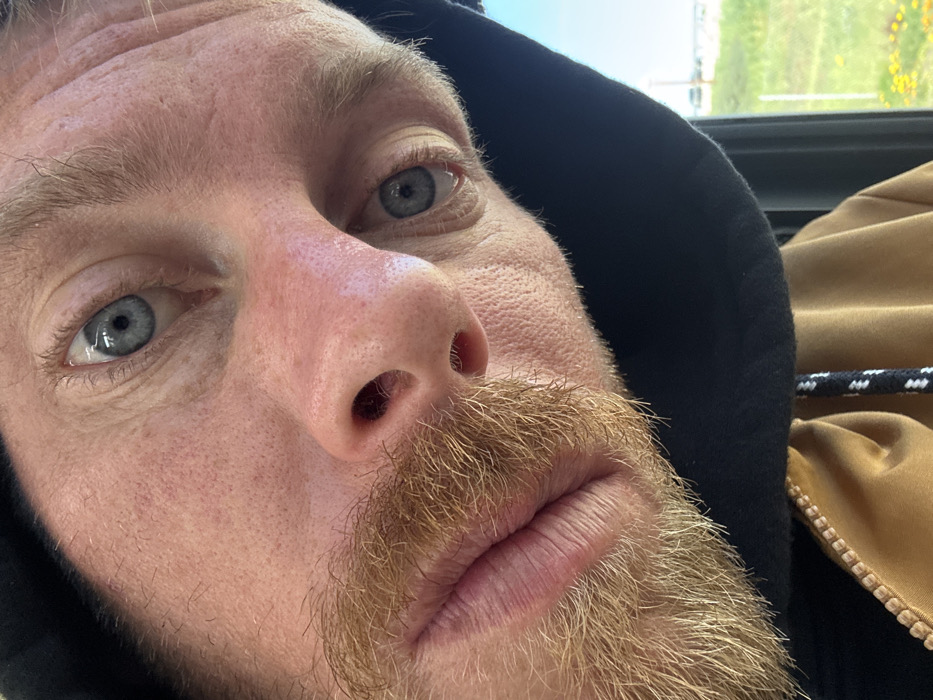 A close-up of a light-skinned man with blue eyes, blonde stubble and beard, wearing a black hoodie. The camera angle is from below, accentuating his nose. The background shows a hint of greenery outside a car window, suggesting he is indoors. He appears relaxed, with a slight furrow in his brow, creating an introspective look. Part of a tan jacket with a black and white cord detail is visible on the right side.