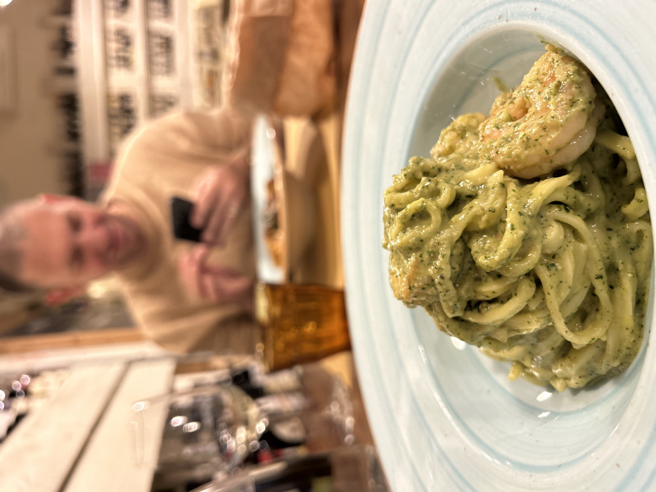 An indoor scene at a restaurant in Como, Italy, captures a dining experience. In the immediate foreground, a light blue ceramic plate holds a serving of pasta, likely tagliolini or spaghetti, coated in a thick green pesto-like sauce and garnished with several cooked shrimp. The plate features concentric ridged lines along its rim. Behind the focal plate, a table is set. To the left, two clear wine glasses, one partially filled with a pale liquid (presumably white wine), are visible. To the right of the wine glasses, an amber-colored, textured glass contains a beverage. Further back, a blurred male individual with short hair and wearing a light brown or beige long-sleeved shirt is seated at the table. He is actively engaged with a black smartphone held in both hands, looking down at the screen with a slight smile. Another partially eaten meal in a white bowl or plate is visible on the table in front of him. To the far right, a brown paper bag, likely containing bread, rests on the table. The background shows shelves stocked with numerous wine bottles, indicating a restaurant or wine bar setting. The lighting is warm and ambient, creating soft bokeh effects from distant lights.