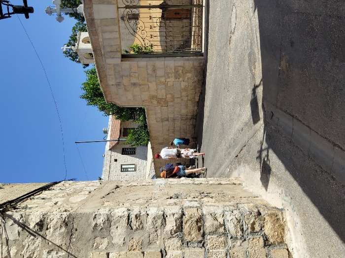 The image captures a sunlit street scene in the Old Tarshiha area of Maalot Tarshiha, Israel