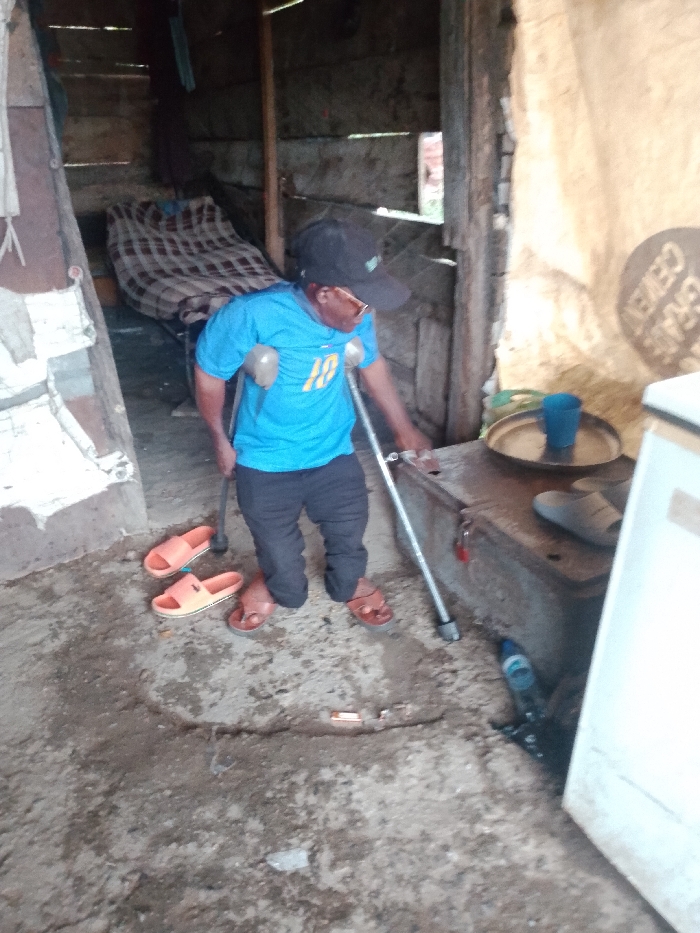 An individual is depicted standing within a rustic, partially enclosed structure in Adankolo, Nigeria. The male subject, of short stature, wears a blue t-shirt with a yellow "10", dark pants, a black baseball cap, and sunglasses. He uses two metal crutches for support, with his left hand holding one and his right hand extended towards a low concrete structure on his right. He wears brown open-toed sandals. Behind him on the uneven dirt floor are two orange slide sandals. To the subject's left, a wooden-walled interior is visible, containing a bed frame with a plaid-patterned mattress or cover. A white garment hangs on a wall support to the far left. To the subject's right, the low concrete structure serves as a surface holding a metal tray, a blue plastic cup, and a grey slipper. A white appliance, possibly a refrigerator, is partially visible at the far right edge of the frame. The wall behind the concrete structure is a light-colored fabric or tarp, exhibiting faint, reversed text, "GRAIN CEMENT". A blue plastic bottle lies on the ground near the base of the white appliance. The floor throughout the scene is a rough, cracked dirt or concrete surface, with a small rectangular object visible in a crack in the immediate foreground.