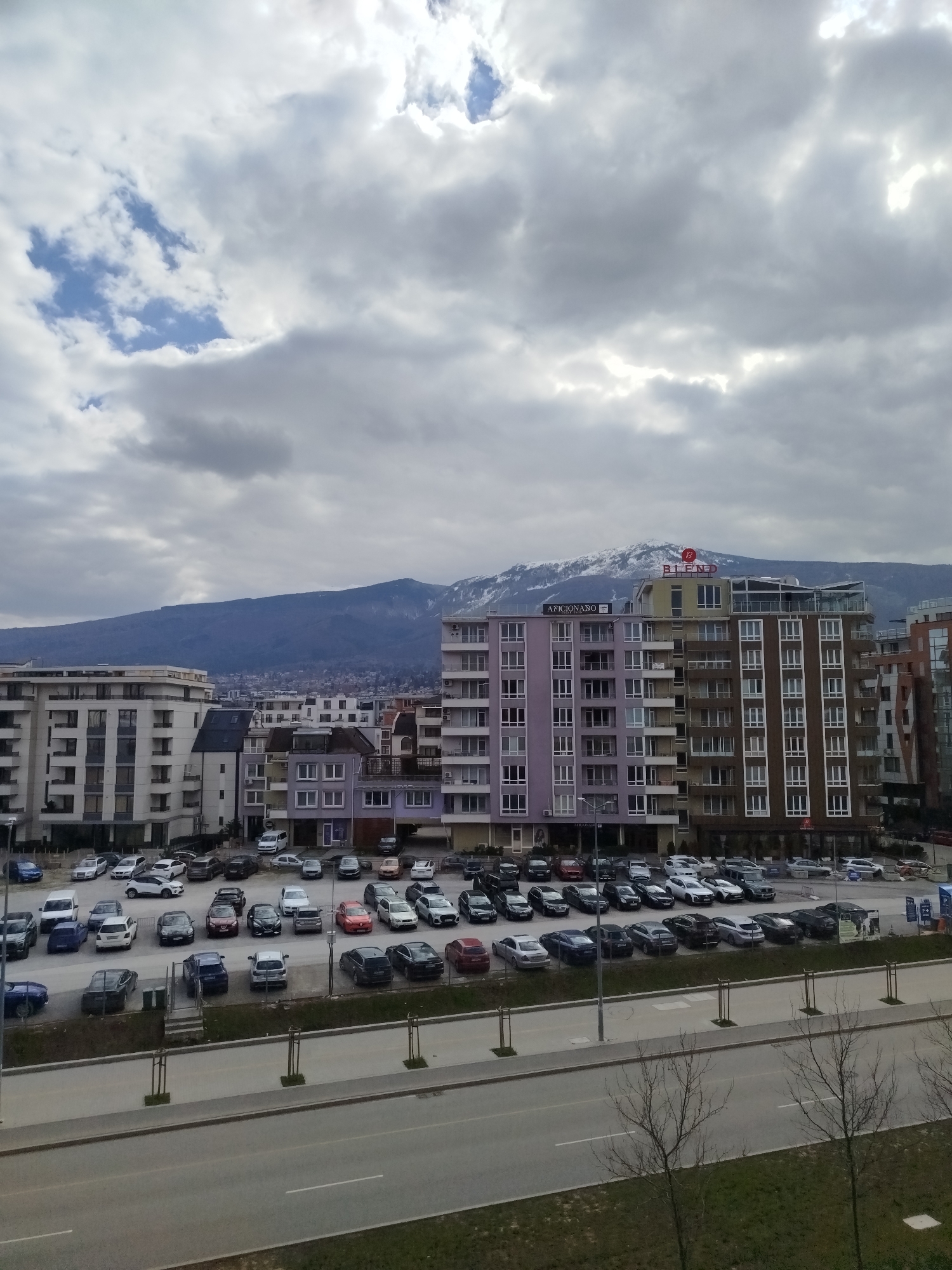 This image presents an elevated view of an urban landscape in Sofia, Bulgaria, with Vitosha Mountain in the background. The sky is predominantly overcast with large grey clouds, showing intermittent patches of blue. In the immediate foreground, a wide, multi-lane asphalt road with distinct white lane markings stretches horizontally. Adjacent to the road, a narrow strip of dormant grass is visible, interspersed with several bare-branched deciduous trees. The midground is occupied by an extensive, open-air parking lot filled with dozens of stationary passenger vehicles of diverse makes, models, and colors, neatly arranged in rows. A tall street light pole is centrally located within this parking area. No active vehicle movement or pedestrian presence is discernible. The background consists of multiple modern, multi-story buildings. A prominent purple-hued building displays "AFICIONANO" signage on its facade. Adjacent to it stands a taller building with a brown facade. Further back and slightly to the right, a building is topped with a large "BLEND" sign featuring a red stylized 'B' logo. To the left, another large, light-colored building with numerous balconies is visible. The distant horizon is dominated by the imposing, snow-capped peaks of Vitosha Mountain, partially shrouded by the cloudy conditions. No individuals or specific interactions are observed within the scene.
