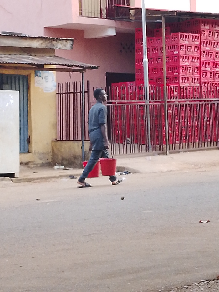 The image displays an urban street scene in Maiburiji, Nigeria. A male individual, attired in a dark grey short-sleeved tunic and matching trousers, wearing dark flip-flops, walks from right to left across an asphalt road. He carries a red plastic bucket in each hand, held at his sides, and looks forward and slightly upward. To the immediate left background, a single-story structure with yellow walls and a weathered corrugated metal roof is visible, featuring a light blue door and white objects hanging near its roof support. Further back, on the right side of the frame, a multi-story building with pink-red walls is present. A prominent vertical metal pole stands in front of this building. A dark metal fence runs horizontally along the sidewalk, behind which a substantial quantity of red plastic crates is stacked multiple high against the pink building, forming a solid wall-like arrangement. The ground consists of an asphalt road with minimal debris and a dirt/concrete sidewalk.